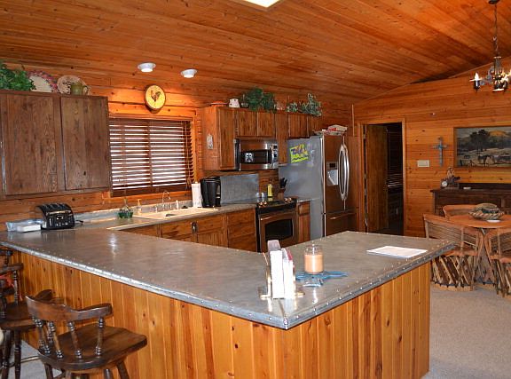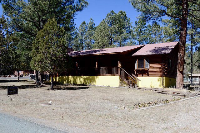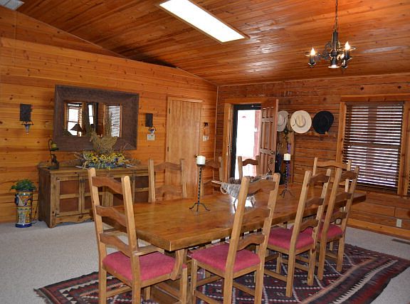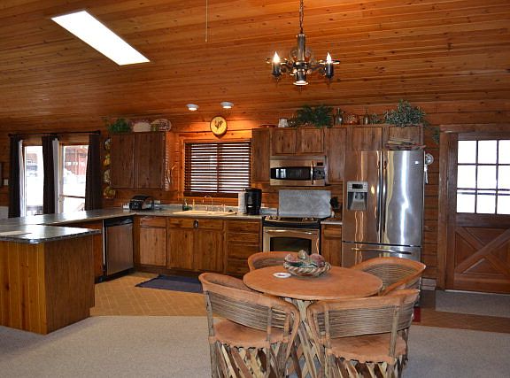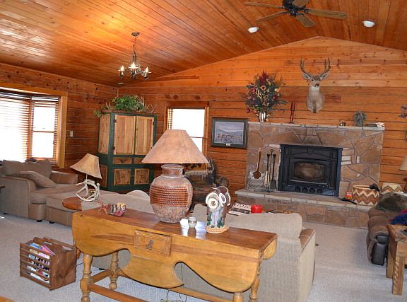 Super clean, one level log home with metal roof. Large corner lot. Main house has 2 bedrooms, 2 baths, Stainless appliances. Flagstone fireplace with woodstove insert, Metal counter tops in kitchen, cathedral wood ceilings. Fully furnished. Front and rear covered porches, large fenced back yard. Open LR, Kit, and dining area. Detached double garage with 1 bedroom, 1 bath guest apt.