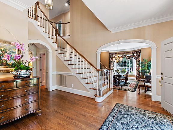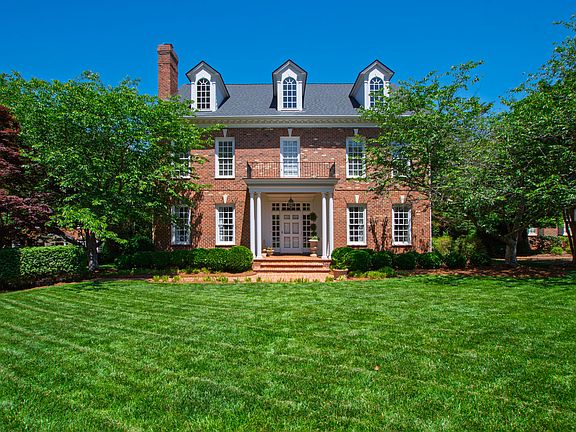 Nestled in the serene elegance of Country Club Hills in ''Upper Buncombe'', this exquisite brick Colonial estate is a rare find—offering timeless design, gracious living, and an unbeatable location. Tucked away on a quiet cul de sac just minutes from Midtown, I-440, and a short drive to downtown Raleigh, this home offers the perfect blend of privacy and accessibility. Enjoy the proximity to the scenic greenway for walking, biking, or running amid natural beauty. Built by the renowned Harold Carter, known for his classic craftsmanship and attention to detail, this residence boasts 4 spacious bedrooms, 3 full and 2 half baths. The main level stuns with soaring 10-foot ceilings, transom windows, elegant arched doorways, intricate crown molding, and gleaming hardwood floors that flow through bright, naturally lit rooms. A gracious foyer leads into expansive formal spaces and a thoughtfully designed open-concept kitchen, breakfast area, and den that seamlessly connects to a cozy family room with one of two gas log masonry fireplaces and lovely bookcases. The kitchen hosts a center island, butler's pantry, walk-in pantry, and dry bar, perfect for entertaining family and friends. Step outside to a covered back porch and patio—ideal for relaxing or hosting guests. The oversized two-car rear-entry garage offers additional convenience. Upstairs, enjoy a generous bonus room and a third-floor walk-up attic, already plumbed for a bathroom and ready to be finished for more bedrooms or living space. Meticulously maintained by the original owners, this home has a three year old roof and recent hot water heaters. The possibilities are endless. This is refined Raleigh living at its best.