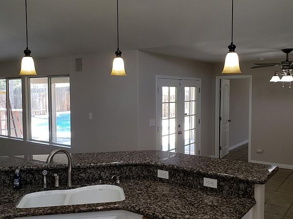 4 bedroom, 2 baths, great room with fireplace, tons of tile floors, new carpet, new paint inside and out, gorgeous white cabinets, granite counters in the kitchen, SS range & microwave, utility room. Master suite has separate tub and shower, makeup vanity and walk in closet. Rear yard with shimmering pool, covered patio, BBQ area 2 car garage and RV or Trailer parking may be possible.