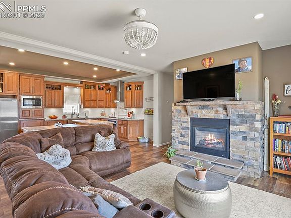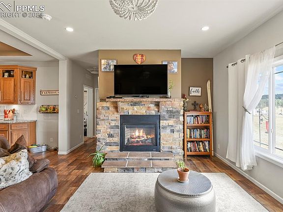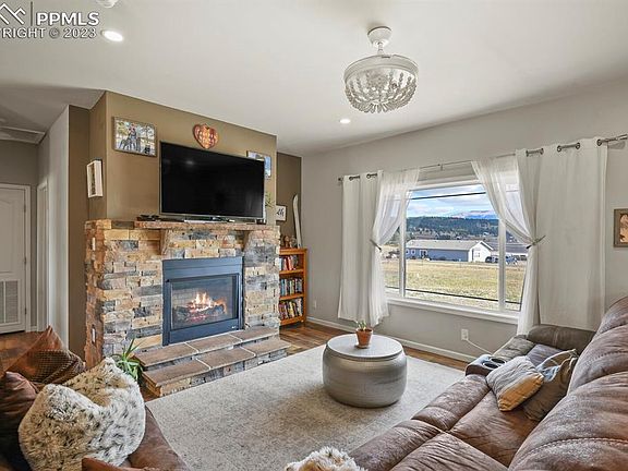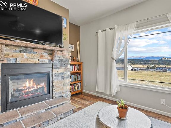 Looking for a place with no HOA/Covenants? This ranch style home sits on over 2 useable acres with a spectacular view of Pikes Peak! The cozy living room looks squarely at Pikes Peak and is open to the expansive kitchen and dining area. The fireplace adds warmth and mountain vibes, a must for every chilly evening in the Rockies. The kitchen has lots of cabinetry, a pot filler tap above the stove, and a large island with seating and updated USB outlets. The owner's suite has barn doors on the closet and an adjoining luxuriously sized 5 piece bathroom with a gorgeous soaker tub. A built in towel organizer area is a convenient and functional bonus to the room. Laundry is a cinch, no stairs here! Two additional bedrooms and a full bath are down the hall. The entire lot is fenced, there are some fruit trees (apple & peach), berry bushes (blueberry & honey berry), raised planters, a storage shed, and a chicken coop. Plenty of room for a garage or other desired improvements. Near the Florissant Fossil Beds (a dark sky community), Florissant, Cripple Creek, Mueller State Park, Lake George, and endless areas of mountain exploration. Sweeping views of the stars and sky are just one of the many reasons to call this home, make an appointment to see this one today!