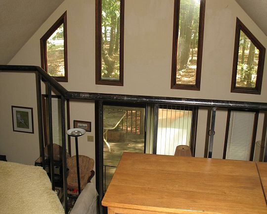 A-Frame surrounded by trees. Save $$$ doing your own updates. 1st floor with great room, kitchen, 2 bedrooms, full bath, large deck and 2 porches. 2nd floor loft area is master suite and has its own deck. Detached storage building 16x12.