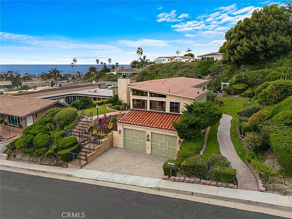 Perched on one of southeast San Clemente’s premiere streets, this stylish mid-century home features a preserved and expansive ocean view. This is a special tract featuring all single level homes with major ocean views. The neighborhood has a feeling similar to Riviera District in the southwest. Very pristine inside and turnkey to its original 1981 construction, this home was meticulously built by the original owner front he ground up. New carpet has recently been added throughout to enhance the cozy coastal cabin-like interior. Vaulted wood-beamed ceilings adjoin fire-warmed living, dining and a huge ocean-view kitchen with large centered island and breakfast nook. Major ocean-views can be seen from almost every room inside the home and most of the exterior spaces. Sprawling grounds on a 10,000 sq. ft. lot create a magical and lush setting, very green and inviting with unmatched privacy. Opportunity for expansion with a small guest house or ADU, lap pool, patios and decks. The home includes two generous bedrooms (one being the primary suite with direct ocean view), an additional full/guest bathroom and powder bathroom servicing the main living areas. Very private and secluded on a quiet non-thoroughfare street with underground power lines, the home offers a two-car garage with 3/4 bathroom inside, laundry machines, and AC. A unique opportunity near great restaurants & cafes, bikable to world-class surf, walkable to the 2.5 mile beach trail, San Clemente Pier and San Clemente’s great beaches. *Plans / designs (conceptual only) for a future remodel / addition are included in the sale. Conceptual renderings are featured in the listing.