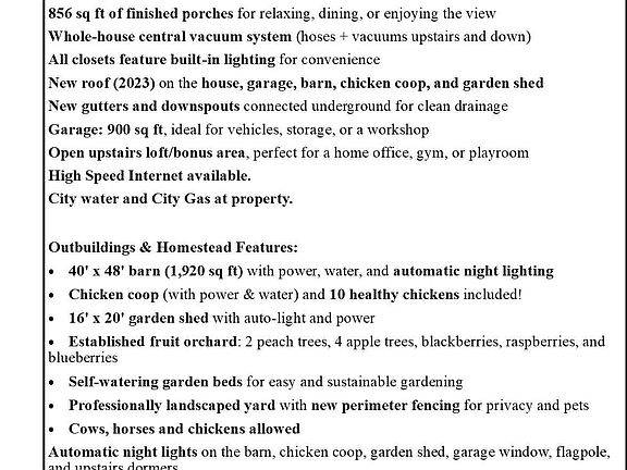 Nestled on 20.7 beautifully maintained acres, this 3,440 sq ft 4BR/3BA custom home offers a rare blend of modern updates, self-sufficiency, and peaceful rural living. Gorgeous Primary on main with large bath and W/I closets. The remodeled kitchen (2023) with all new appliances and a breakfast nook, is perfect for family gatherings. Enjoy entertaining outdoors with your 856 sq ft of finished porches for relaxing. You will love the Whole-house central vacuum system . All closets feature built-in lighting for convenience. New roof (2023) on the house, garage, barn, chicken coop, and garden shed. All gutters and downspouts connected underground for clean drainage when roof was put on. The Garage is 900 sq ft, ideal for vehicles, storage, or a workshop. The 40' x 48' barn (1,920 sq ft) with power, water, and automatic night lighting Chicken coop (with power & water) and 10 healthy chickens included! 16' x 20' garden shed with auto-light and power Established fruit orchard: 2 peach trees, 4 apple trees, blackberries, raspberries, and blueberries Self-watering garden beds for easy and sustainable gardening Professionally landscaped yard with new perimeter fencing for privacy and pets Automatic night lights on the barn, chicken coop, garden shed, garage window, flagpole, and upstairs dormers. The restrictions do allow for cows and chickens! Come and visit this great farm! Buyer to verify all info please.