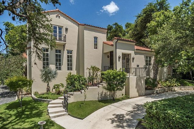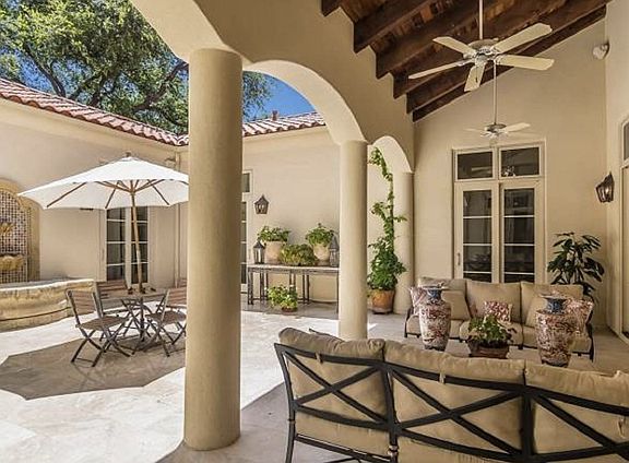 This exquisite Mediterranean home has it all. The gorgeous detail work and styling are second to none. A Grand entrance with substantial front door & wrought iron railing opens to the first floor and surrounds a partially covered courtyard with fountain. The master suite boasts a large spa tub, grand closet, exercise room and patio. A arge living room w with fireplace connects dining room and wet bar. Gourmet kitchen, office. Ample natural light w/ Pella windows & doors. Plans for small pool are available.