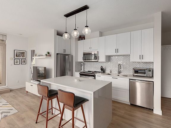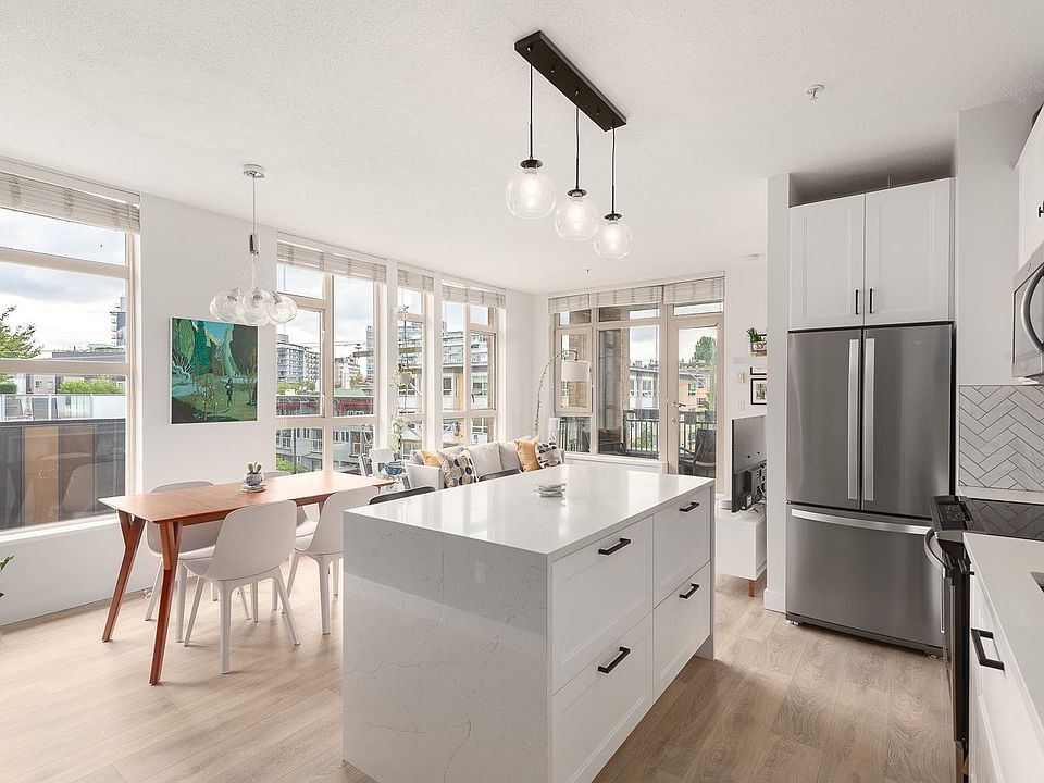 Welcome to The hub - A beloved low-rise boutique building, quietly nestled in a vibrant community packed with amazing amenities. This top floor 2 bedroom, 2 bathroom suite is bright and located on the quiet side of the building. Offering an open concept floor plan with 884 sqft of living space, and complemented by over-height ceilings & picture windows. The functional kitchen features quartz counters, s/s appliances & a large island. Good separation between bedrooms, plus in-suite laundry and storage. This unit has a private patio, or visit the shared rooftop with sweeping views of the city and mountains. 1 secure parking stall is included. Pets & rentals are allowed. Coffee shops, breweries, restaurants, transit, and more are all at your doorstep. New Broadway Skytrain line coming soon!
