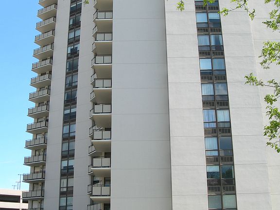 A 1,450 square foot end unit condo. Contains 2 bathrooms & two bedrooms each with walk-in closets. Fully equipped eat in kitchen. W/D in unit, new laminate flooring and w/w carpeting in bedrooms. Amenities include: 24 hour front desk, 3 upgraded high speed elevators, updated fire/security system, lighted covered assigned parking with controlled access, in house mail box, vending machines, copy/fax availability, & ground level lockers. Well appointed lobby with gas fireplace. Roof top room has treadmills, flat screen TV, 2 bathrooms & kitchen with panoramic views! Exceptional building & grounds maintenance. Pets welcome. Only second owner. Condo fee $556 /month. By appointment only.