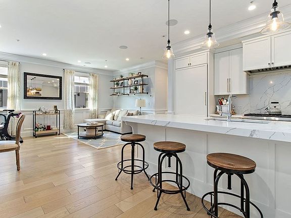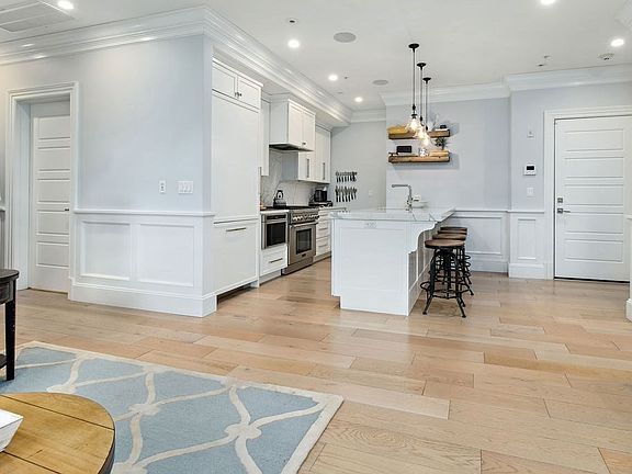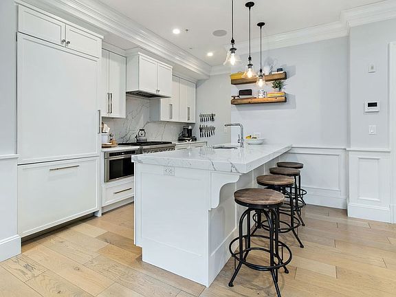 Spacious corner 2 bed/2 full bath penthouse condo features 2 garage deeded parking spaces in a professionally managed, elevator building. The sun filled open floor plan showcases large windows, beautiful wide white oak floors, custom moldings and cabinetry, Cambria Quartz countertops and backsplashes, a large pantry, and top-of-the-line Thermador kitchen appliances including a gas range and beverage refrigerator. The primary bedroom has a large walk-in closet with custom shelving, a balcony and a stunning ensuite bathroom featuring marble floors and a walk-in glass shower. Additional features include in unit washer/dryer, Bluetooth audio throughout, large storage closet, and central air conditioning. During the summer months enjoy cooking and eating outside at the common courtyard with gas grills. Walking distance to South Boston’s favorite spots including Tatte Bakery, Loco, Castle Island Brewing Company. Open houses Sat. & Sun. 11:00 - 12:30 This is the one you've been waiting for!