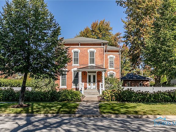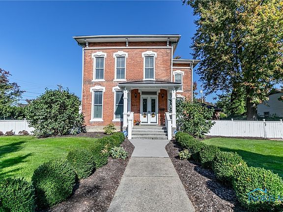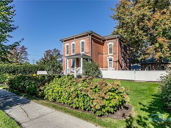 Italianite home in historic Downtown Maumee, loaded w/ character & charm. Original 9ft doors & hardwood floors +12in handcrafted base molding throughout. Sprawling living room w/marble gas fireplace & bay window adjoins formal dining room w/ marble gas fireplace. Sunroom w/ vaulted ceiling opens to private fenced yard. Beautifully updated kitchen w/granite counters, tile backsplash, ss appliances/gas stove & custom cabinets. Full bath w/ claw foot tub & adjacent bedroom + den/bedroom on main fl. Primary Bedroom Suite w/ laundry + 3 additional spacious bedrooms & full bath on the upper level.