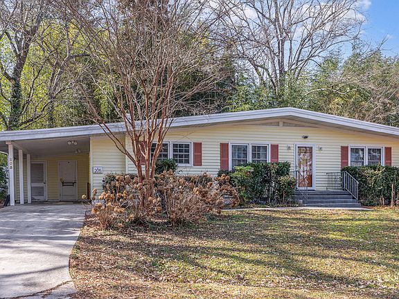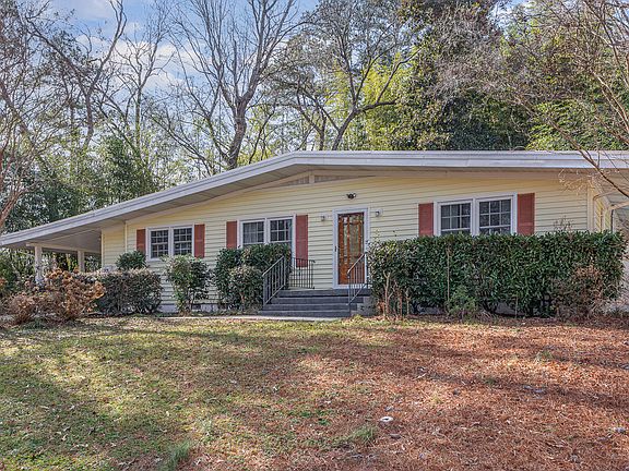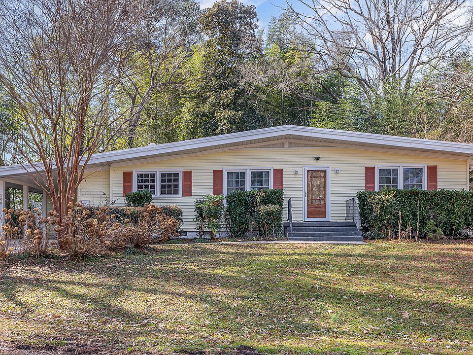The original owner of this mid-century gem had a successful career in New York and retired to her hometown of Louisburg in 1957. Urban legend has it that she designed the floor plan to be reminiscent of her Manhattan apartment. The large front porch enters into a sunny room that can serve as a formal greeting space for visitors or for dining. The great room features a wide fireplace flanked by floor-to-ceiling windows that look over a fenced-in backyard. French doors lead to a screened porch. The two generous-sized bedrooms have ample closet space and each with private bathrooms. Three large hall closets, great for storage! Twenty-first century updates include double-paned windows, vinyl siding, heat pump, remote-controlled natural gas logs, a tankless water heater, and fully encapsulated crawlspace. Very unique home close to everything Louisburg has to offer!