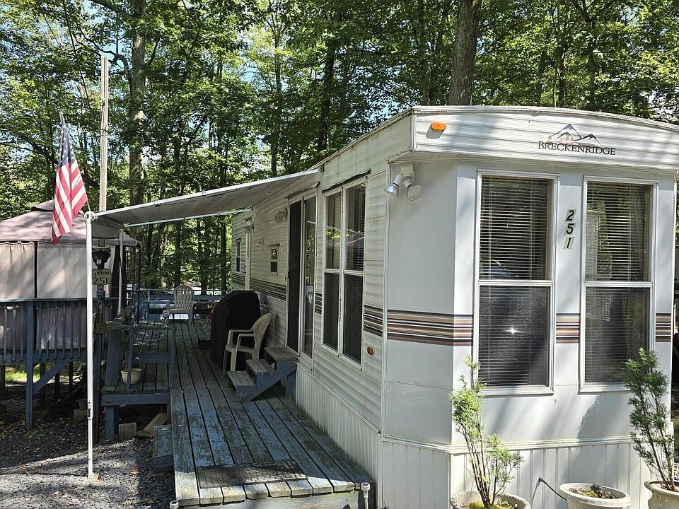 TURNKEY Breckinridge 2 BEDROOM PARK MODEL circa 2002 with FULL SIZED APPLIANCES, FULL BATHROOM WITH TUB, DECK, GAZEBO AND Amish SHED. 30 AMP SERVICE . Deck has built in seating across back Camper is skirted undermeath and additional electric outlets have been added outside for convenience. Lot is staked and parking area has been recently graveled. CENTRAL AIR. Comes with furnishings including sleeper sofa. SLEEPS @ least 6 comfortably. Lake Adventure is a year round camping community with OWNED lots . INCLUDED in dues are ELECTRIC , SEPTIC, and WATER. It is located within an hour of most major Pocono ski areas from Jack Frost to Masthope. Comfort stations with showers and lavatories are spaced throughout the community. Makes a great place for a secondary ''home office'' enabling breaks to play pickle ball , basketball, or tennis. Gather with friends at the clubhouse or swim at the community pool. Or you could just paddle around Lake Adventure, which is stocked for catch and release(except pickerel.) Stay most days, if you would like, however these properties CANNOT BE USED TO ESTABLISH RESIDENCY, and you must have off-site primary address . Most economical way to have a summer home near Pocono/Kittatinny/Catskill Mtns! Minutes to large supermarkets, local hardware stores, and restaurants. Major box stores within 20 mins.
