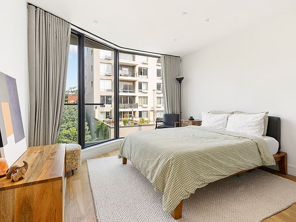 An architectural masterpiece in the heart of Greenpoint. This tranquil and sun filled floor through 2 bed 2 bath apartment features custom floor to ceiling windows throughout, In-unit laundry, central air conditioning, 2 private terraces and unprecedented amounts of storage. The residence exhibits craftsmanship and quality in every detail from the visually striking modern facade to the thoughtful color palette of the interior design. As you enter the apartment your very own private vestibule offers and additional mudroom not shown in the floorplan. The expansive living and dining area opens up dramatically as you enter, with your focus being drawn to an entire wall of south facing windows, flooding the room with natural light. The flow of the space is thoughtful, elegant and functional with a beautiful kitchen leading into the large living area. Top of the line appliances are framed by custom warm grey and wood cabinetry with honed Caesarstone countertops. Two generously proportioned bedrooms are conveniently tucked away for privacy at the rear of the apartment. These rooms enjoy beautiful sunlight and gorgeous leafy views of well manicured back yards. The large primary bedroom comfortably fits a king sized bed and home office with ample closet space. The 2nd bedroom is also very spacious allowing for queen bedroom furniture. The 2nd private terrace flows seamlessly from this room providing a perfect place to unwind and recharge in peace and privacy. The two Minimalist chic bathrooms outfitted in Topus concrete tile include wall-mounted vanities in Nordic oak that float within the space and are topped with a white Corion countertop. A stylish collection of fixtures and hardware in matte black, including designer sconces in oil rubbed bronze with an opal globe, and a striking round metal framed oil rubbed bronze mirror, complete these spaces. Within the surrounding blocks you'll find a myriad of exquisite cuisine that spans the globe, eclectic coffee shops and bakeries, yoga studios, independent retailers and larger super markets.. Conveniently located just 1 block from the G train entrance. Two stops to the South provide an easy transfer to the L Train, or two stops North get you to the 7, M & E trains. This is truly one of the best connected parts of the whole city providing you access to most of downtown and midtown within 20 minutes or less.