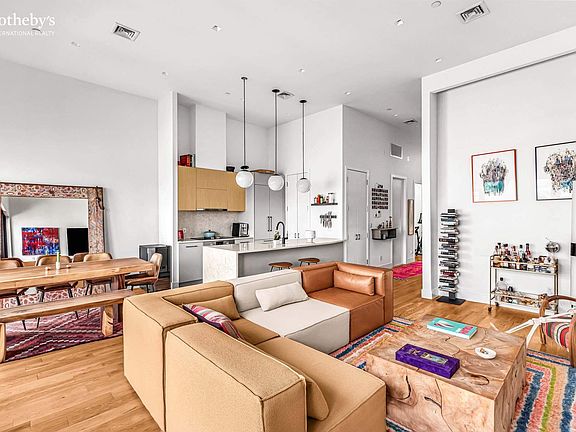 This Brooklyn penthouse is an absolute showstopper!! The truly unique residence has soaring 13-foot ceilings, and 1,380 interior square feet. Angular windows at various levels, and a floating staircase allow this open-concept layout to sift sunlight into every corner and highlight the home's quality construction. Stylish finishes create a chic yet cozy atmosphere and breathtaking views of the city skyline can be had from almost anywhere in the home. Every room offers unique design and natural light from both north and south exposures. The expansive living area is perfect for entertaining, with a spacious dining alcove as well as a private balcony. The open kitchen features custom wood cabinetry, Caesarstone countertops and beautiful backsplashes. All appliances are Bosch, including a paneled refrigerator, freezer, dishwasher, and washer dryer. Beautiful hand-made pendants hang above the huge kitchen island to complete the space. Down the hall, you will find a primary bedroom like no other. A wall of tilted custom windows brings in beautiful light and tree lined views. A dramatic long hallway leads to a walk-in closet and en suite bath with glass enclosed shower and a frosted bathroom door. Both luxurious bathrooms have Topus concrete tile, Nordic oak vanities, white Corion countertops and matte black fixtures. The second bath has a deep soaking tub. Just outside the primary bedroom is a glass staircase leading to a queen sized sleep loft, also with custom tilted windows. This space is ideal for guests or as a private workspace and features extraordinary light and views. The separate office space, which could be converted to a sleep area or nursery, has dramatic ceiling height with a high window bringing in lovely all day sunlight. Step outside to your phenomenal private two-level roof deck, an urban sanctuary where you can relax, garden, or host gatherings under the stars. This expansive outdoor space offers breathtaking 360 views of the city skyline and even has a custom designed canopy. 205 Freeman is a striking condominium designed by IONA and built in 2019. It is conveniently located between McGuiness Blvd and Manhattan Avenue, with access to the G train as well as the 7 train for easy commutes to Manhattan. The entrance to the BQE is also just a few blocks away for weekend trips out of the city. Celebrate the mixture of classic and new in Greenpoint, whether you're catching a sunset at Transmitter Park, grabbing a bagel at Bakeri, or enjoying a rooftop drink at Bar Blondeau, you'll discover what makes Greenpoint one of the best neighborhoods in Brooklyn!
