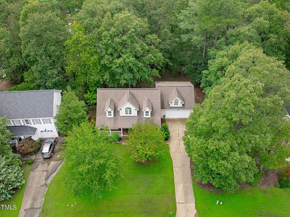 Located in one of Holly Springs most desirable pool, tennis, and playground communities is this spacious Cape Cod. The front porch that spans the whole front of the house welcomes you across the manicured front yard and into the open, airy entry with warm hardwood floors throughout the majority of the main living areas. The formal dining room is well appointed with crown molding, chair rail, and an updated, contemporary chandelier. Sized to accommodate a variety of table shapes, the two-tone color palette is also adaptable to a variety of decorating styles. A tastefully finished gas log fireplace beckons you into the expansive family room. Complete with vaulted ceilings, recessed lights, ceiling fan, and a sweeping view of the exposed staircase and upper walkway, the space is dramatic. Double ovens and plenty of space for a large island or breakfast seating, along with the warm neutral color scheme of the full height cabinets and tile backsplash, make the kitchen feel warm and inviting. Tucked away at the front corner of the home, the owner's suite is a relaxing refuge, complete with crown molding, ceiling fan, chair rail, and neutral 2 tone color palette. The gleaming en-suite showcases a large garden tub situated in a bay window with views of the wooded back yard. Dual sink vanity, step in glass door shower, and walk in wardrobe complete the bright, open space. Ascending the open staircase to the walkway, the hall bath is situated between the other 2 bedrooms. Newly remodeled, the hall bath boasts a large arched window, custom tiled frameless glass step in shower, marble topped vanity, and linen closet for added storage. Both bedrooms feature such architectural details as angled ceilings, bright dormer windows, ceiling fans, and large closets. Floored attic space is accessible at the rear of each upstairs bedroom closet. With its own staircase, the bonus room is nestled over the garage. Complete with a custom built in entertainment center, several top lit display cases, a large dormer, and 2 ceiling fans, this space could be used as a game room or home office. The large dormer and light, neutral color palette bathe the space in light. The 2 car garage has an epoxy finished floor, and added cubbies for a mudroom style organization station. Outside, the large deck offers plenty of space for a grill, fire table, or outside dining to enjoy the views of the tall hardwood trees in the fenced and shaded back yard. Situated inside the RTP, this home has easy access to all major interstates and is within 30 minutes of Raleigh, Durham, and Morrisville making it ideal for commuting or finding entertainment, cultural arts activities, fine dining, and numerous recreational parks.
