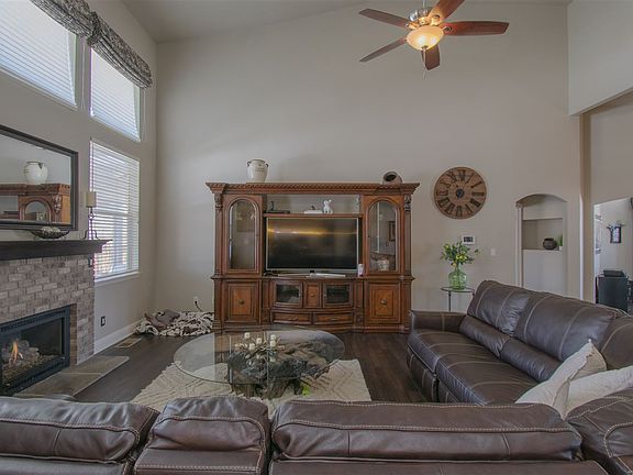 Beautiful spacious home on oversized lot with mature landscaping, mountain views, on a cul-de-sac. The front porch welcomes you home and once you enter through the front door you will experience high ceilings, open floor plan, and lots of natural lights. Like the outdoors? Enjoy the backyard perfect for entertaining with built-in fireplace, partially covered patio, and large backyard. Need RV parking? In addition to the 3 car garage, this property offers RV parking with clean-out and an oversized gate.