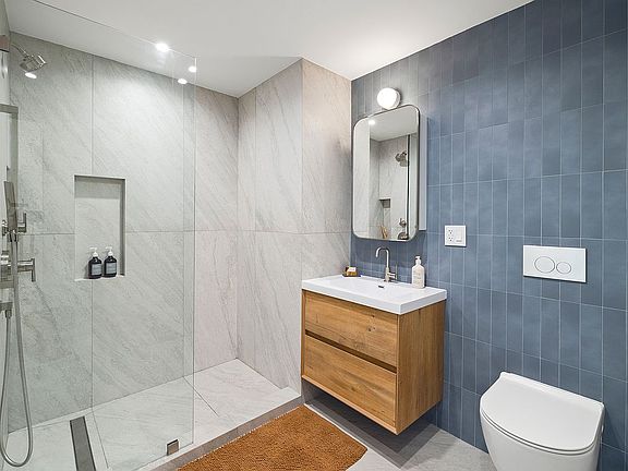 The bedrooms are generously proportioned, with ample storage, including walk-in closets in select units. Primary suites feature luxurious ensuite bathrooms adorned with large matte stone tiles, striking blue stone tile accent walls, spacious walk-in glass showers, and elegant wooden vanities. Additional bathrooms offer deep soaking tubs, convenient storage closets, and washer/dryers. Heated bathroom floors add even more comfort.