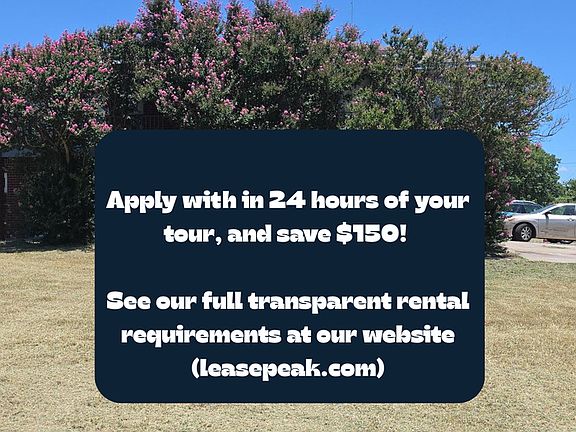 If you apply within 24 hours of your tour, you'll save $150 on your move in costs ADDITIONAL.