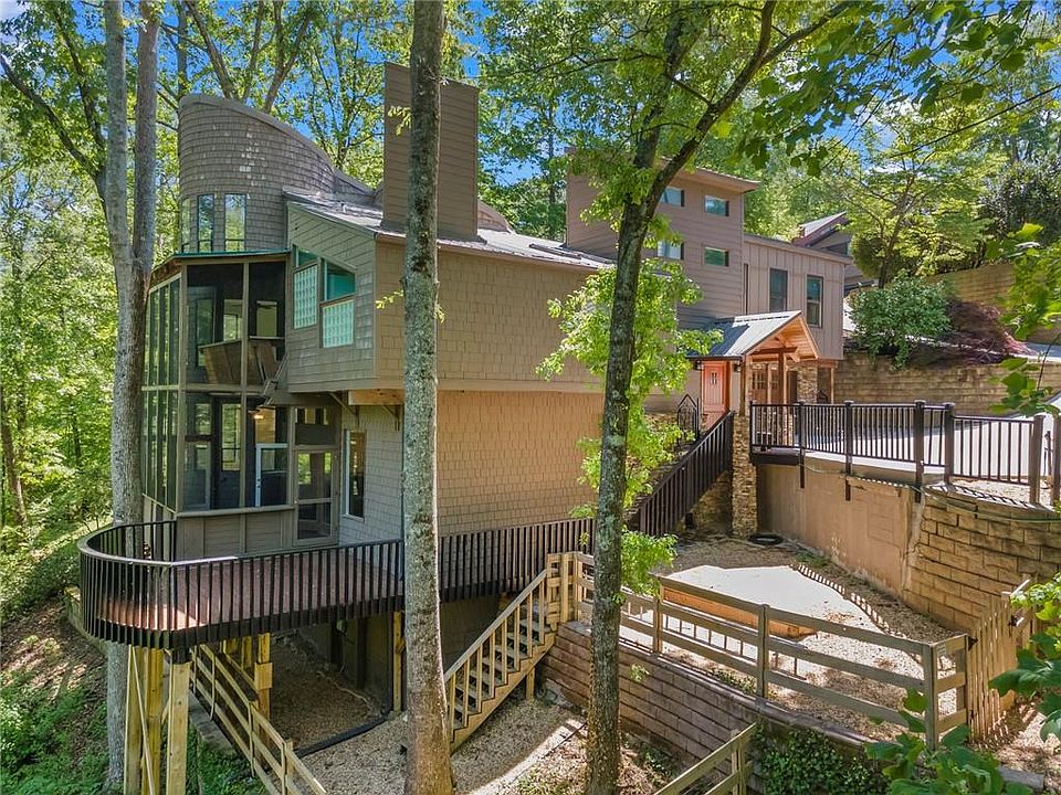 Live at the intersection of history and nature in a one-of-a-kind, multi-level, contemporary retreat designed by renowned builder Earl McMillen. This nature lover's treehouse offers a private, peaceful, natural setting with spectacular views of Vickery Creek and the Chattahoochee National forest. All this, minutes from the heart of Roswell’s popular Canton Street, historic mill area, walking trails, scenic covered bridge and waterfall. Signature curved walls, floating steps, soaring ceilings, and walls of windows provide architectural interest. An addition doubled the original square footage of the house, and includes a new front entry with two-story foyer, bonus room above garage, and two-story Studio/Guest Suite. On the main level, a fireside great room opens to a two-story screened porch and open deck. Dining room features a curved wall of windows and panoramic views. Kitchen is open and light, with unique curved walls, teakwood cabinets, stainless appliances, and quartz countertops. On the upper level, Primary Suite includes a sitting room with French doors opening to a screened deck, bedroom with curved wall of windows, and studio/loft above the bedroom accessed by a spiral staircase. As a bonus, there’s a walk-in attic off the studio/loft. Two secondary bedrooms are spacious and light. From the main foyer, floating stairs lead to a Bonus Room over the garage. Create a game room, media room, office … or all three! Two-story Guest Suite is accessed through a private door from the garage. Sitting Room with morning kitchen opens to a private screened deck, and vaulted bedroom and bath are upstairs. Seller has provided a detailed list of renovations, improvements, and systems, which includes new windows, new driveway, high efficiency HVAC and electronic air cleaning system, new garage doors, whole house water filtration, and more. Don’t miss this unique opportunity to live in a streamside mountain setting only minutes from vibrant city life.