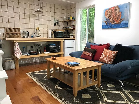 My husband and I have the good fortune to be tucked away in the woods near University Lake, surrounded by trees and wildlife, but only 10 minutes from downtown Chapel Hill. We recently renovated an old shack on our property and turned it into a beautiful, welcoming "tiny house" which is completely private and set back in the trees. There is a downstairs living space with a convertible (sleeper) couch, chair, flat screen tv, chest-of-drawers, coffee table that converts to eating height, and a well equipped kitchenette (large toaster oven, microwave, induction hot plate for cooking, small fridge, electric kettle). Upstairs you will find a super comfy queen size bed and calming views of the forest in every direction. The bathroom is beautiful with handmade tiles, a walk-in shower and an eco-friendly composting toilet*. We are a short five minute ride to the restaurants and shops in charming downtown Carrboro (called the Paris of the south, though that's kind of a stretch!) and 10 minutes to the center of Chapel Hill and UNC. We are very close to University Lake, many hiking trails, and Carrboro's weekly farmer's market. There is plenty of off street parking and the entrance to the highway is only 5 minutes away, or you can drive over to "park and ride" and take the free UNC bus all over town. My husband and I are very low key and easy to get along with (at least we think so! haha) and welcome any questions you may have! *Composting toilets are not on everyone's radar, but they are great for the environment and don't use any water! There's no bad odor at all and you use regular toilet paper. All utilities are included in monthly rent. There is wifi and a smart tv, but no cable. If you choose to get cable, that bill will be a cost you need to cover. There is not a lot of storage space, but we can store some items for you in our garage. In all honesty, this is best for someone who does not have much "stuff". This is a no smoking property. Please- no loud music or big parties. No washer and dryer, but there is a laundromat 1.5 miles away. We have 4 dogs that are outside (within our fence) a lot of the time. This is not an appropriate place for you if you don't like dogs.