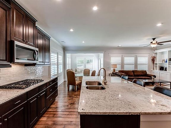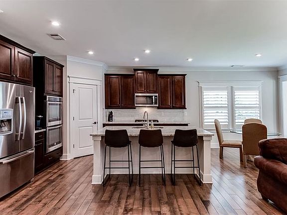 • Kitchen Features: Breakfast Bar, Cabinets Stain, Eat-in Kitchen, View to Family Room, Kitchen Island, Pantry Walk-In, Solid Surface Counters, Cabinets Other