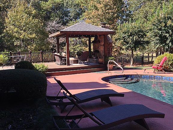 4.8 Acres, 4890 SF. 9 foot ceilings 4 bedrooms, 4 ½ baths. 3 Car Garage. 3 living areas, study, game room. Recently remodeled. Gas fireplace. Screen porch. Large Trex deck with shower and stone fireplace with pavilion. Gunite pool. Fenced backyard. Landscaping with complete irrigation. Brick storage building 400 SF and metal storage building 576 SF. Game room includes regulation pool table