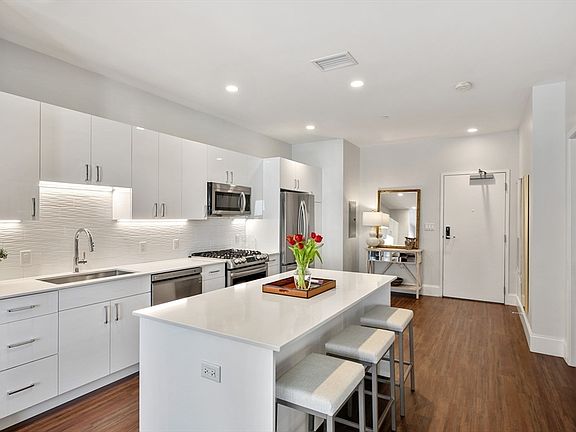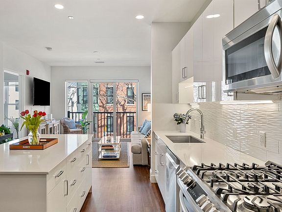 Spacious luxury 2 bedroom 1 bathroom condo in Jeffries Point, East Boston. This apartment is bright and airy with large windows, sliding glass doors and Juliet balcony in the living room, and has all the amenities you'd want. Lots of sunlight, pet friendly building, has in-unit washer and dryer, a gym, common roof deck, and 1 deeded parking spot, plus street parking. The kitchen is stunning in high gloss white with LG appliances, including a vented gas stove. The bathroom is large and spa like with plenty of counter space and storage. There is a bike room and package room. The building is in a highly convenient location close to public transport, the Blue Line and Ferry services to Seaport and the North End, easy access to the waterfront, Piers Park, the Tall Ship, Maverick Square, Logan, MGH. There's even a convenience store right below if you need to grab something quickly. Currently the 2nd bedroom is being used as a home office, so it's perfect for those who work from home too.