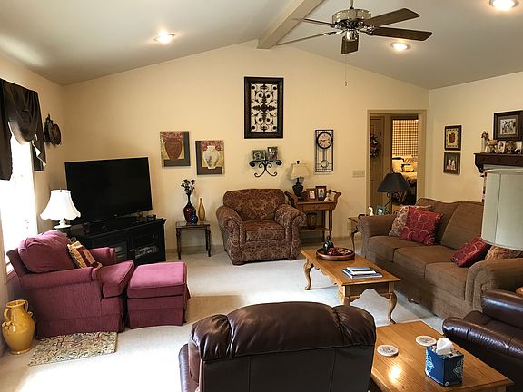 Beautiful custom built 4 bedrooms,2.5 bath home built on a wooded 2.5 acre lot. The house is located on a secluded, dead end street approximately 1.5 miles from the town square. The property also has RV storage and two other separate storage buildings. This 2400 sq. ft. home has a large vaulted living area, whirlpool tub, several walkin closets, several updates and is very energy efficient.