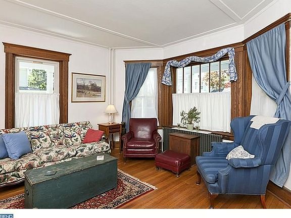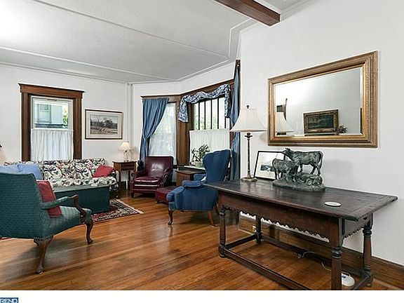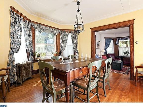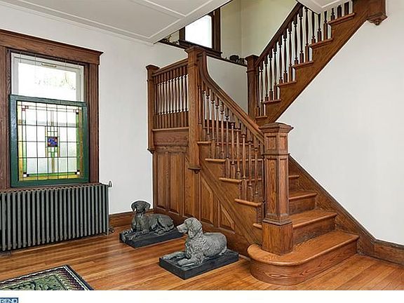American four-square colonial with columns and 36 by 10 wrap around porch. Original chestnut woodwork throughout. Foyer 14 by 10 with handsome, ornate, extra wide turned stairway to`2d level.Red oak floors first floor, hard pine on second floor. Living and dining rooms have bay windows. Kitchen has parquet floor, white cabinets, cntr island, built in china closet and corner cupboard, bead board ceiling and walls, and gas stove. Glassed porch family room has full screens, soapstone gas stove, parquet flooring and leads to a large deck with pergola; deck leads to a large patio centered around a ornamental maple tree. Second floor bedrooms all have large closets, hall bath has bead board walls and ceiling and a claw foot tub. One bedrm opens to a large balcony which overlooks the gardens and rear lawn dotted with old shade trees. A stairway leads to the large high ceilinged attic (31 by 26) with large windows. Oversize two-car gar,inv fence, light and airy basement w outside stairway--complete this great home.