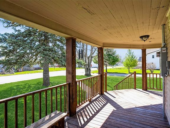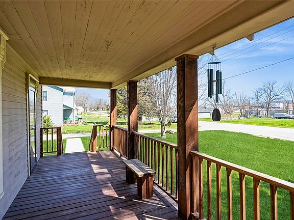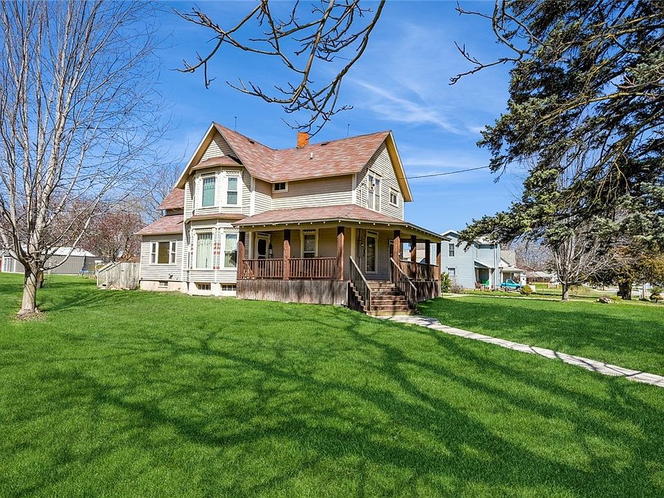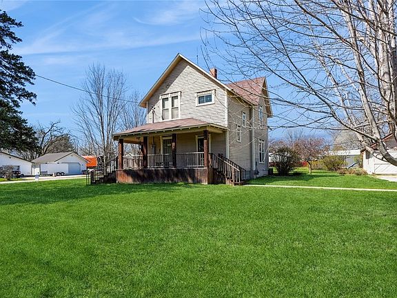Such an amazing old Queen. Stately and beautiful. Wrap around porch for the wicker furniture or your favorite porch swing. A newer deck on tie west side with handicap accessibility, Corner lot with 1.12 acre to do all the lovely flowers and Beautiful gardens needed. An older 2 car garage-with a slide-by door that fits the era. 2200 square feet of living space. A beautiful oak staircase with stained glass windows and original woodwork. Don't forget to look at the interesting chandelier in the stairway on your way up. 10' ceilings and extra large living room/dining room area with bow windows up and down. A center round fireplace adorns the center, Newer windows on this floor. Large eat in kitchen with loads of cupboards and fun older appliances that make this the homes gathering place. Laundry is also located here.. full bath on this floor. Upper level has 4 bedrooms, a master with an en-suite with shower and vanity and stool. Very large with bow windows. the foundation is in great shape and the mechanicals are 5 years old. new electric service put in from outside. You will be amazed at the size of this home and the great things that could make it even more beautiful. I-35 school district and 25 minutes to West Des Moines 12 minutes to Osceola.