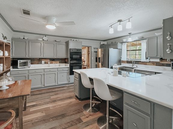Start your mornings on the large covered front porch and wind down in the evenings on the spacious covered back patio. Inside, shiplap detailing and a mix of quality wood plank and luxury vinyl flooring create a warm, inviting country feel. The updated kitchen boasts quartz countertops and plenty of space for meal prep and entertaining. Each bedroom comes with its own bathroom, providing comfort and privacy for the whole family.
