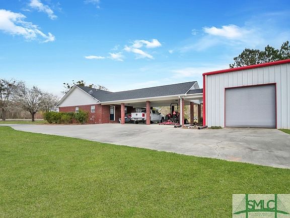 County living in Effingham County, at it's finest! Beautiful 3 bedroom, 3.5 bath brick home with 3 car carport on 20+/- acres. Massive 60x80 heated and cooled workshop originally built as an airplane hangar with a full bath. Rollup doors large enough to accommodate a small plane, plus access to a 3000 foot runway. The homes interior is well appointed with high ceilings, fireplace in the family room, breakfast bar in the oversized kitchen, with dining area. Large laundry room has half bath connected, making it the perfect mudroom just off the carport. Master suite with private bathroom. One guest bedroom is currently being used as an office, but can easily be converted back to a bedroom. Tractor and Mower are negotiable. Fully stocked pond on the property as well!