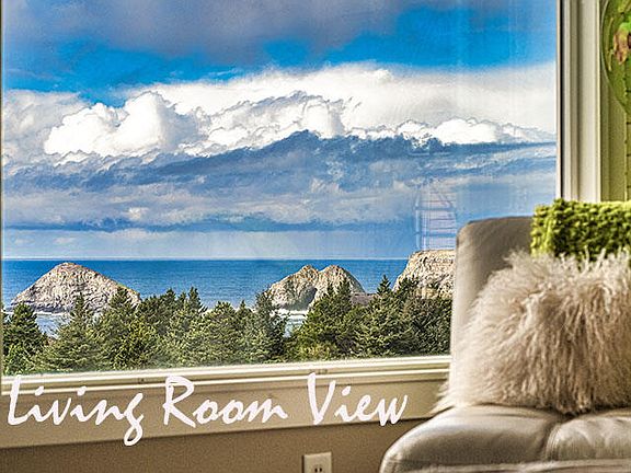 DRAMATIC & SWEEPING ocean view panorama includes majestic 3 Arch Rocks. Hardwood floors,marble frplc, granite counters, slate backsplash in custom kitchen, travertine entry, plantation wood blinds, central air. All bdrms adjoin bathrooms. View deck off the master suite & also off living/dining area. Overlooks greenspace. Located at end of road for quiet enjoyment. Immaculate & inviting. This home is a showplace! The Capes gated community, just 70 miles from Portland.