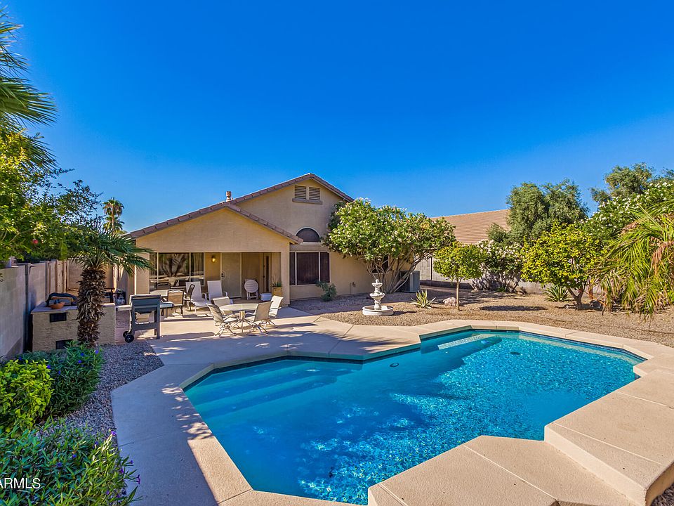 Move-in ready, single-story home with Pool and RV gate nestled in the golf course community of Coldwater Springs. Generously sized 4-bedroom, 3-remodeled bathroom home with vaulted ceilings, cool color tones, and new tile flooring throughout. The spacious floor plan provides flexible living spaces to fit your everyday lifestyle; complete with a large formal living/dining room, kitchen w/SS appliances & extended height breakfast bar, and great room w/fireplace & wall niches for all your home decor. Step outside to copious amounts of backyard space to enjoy peaceful moments outdoors or entertain with a covered patio, built-in BBQ, and refreshing pool surrounded by lush landscaping. RO & Water Softener System, Extended Length Garage & Driveway, Security System.