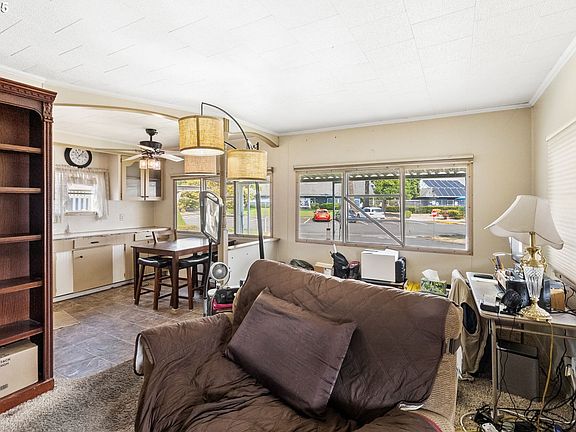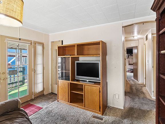 This double-wide Builtmore manufactured home is 40’ x 20’, 800 sq. ft., and was built in 1967. It offers 2 bedrooms and 1.5 bathrooms, with the half bath located in the spacious primary bedroom that also features a walk-in closet and direct access to the backyard. The second bedroom is equipped with shelving on every wall, providing plenty of space for storage, hobbies, or office use. The sale includes the range, microwave, refrigerator, oversized front-loading washer and dryer, bedroom set, dining set, couch, entertainment center, and TVs. Wall AC units are installed in the main living area and primary bedroom, helping to keep the home comfortable. A carport with an attached shed provides covered parking and extra storage, plus two additional sheds in the backyard add even more utility. This is a great opportunity for buyers to add their own updates and personal touch on a home offered at a low price. Cash Only.Chalet Village is a quiet and welcoming 55+ community with a variety of amenities to enjoy, including a recreation center, TV lounge, pool tables, fully equipped community kitchen, saunas, and a seasonal outdoor pool. The community is pet-friendly, has on-site staff, and offers a friendly neighborhood atmosphere. Monthly space rent is $1,015, and all buyers must be approved by the park.