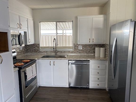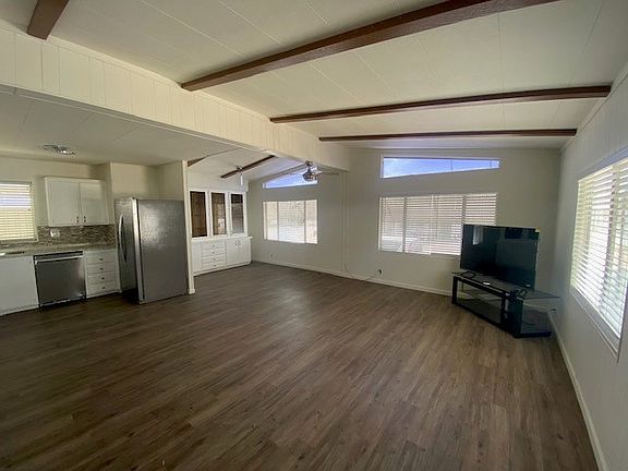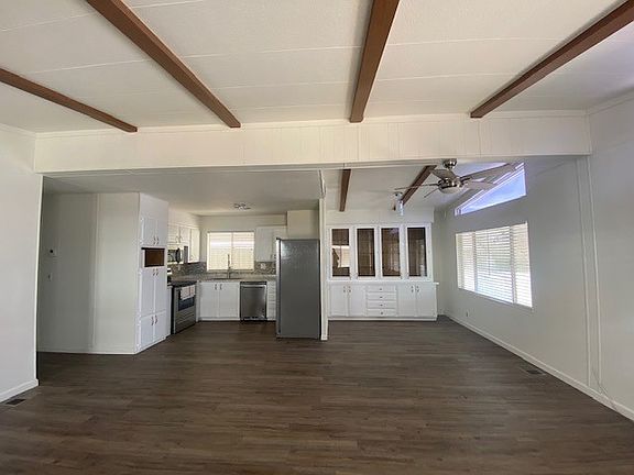 This beautiful blue exterior home leads you to the the large covered deck, and large backyard. Stunning kitchen with stainless appliances, white walls through out with dark beams, open floor plan, laminate flooring - Lots of WOW factor! Large beautiful updated Owners bedroom with walk in shower and light in mirror, guest bath has tub with shower and a light in the mirror. There is a storage shed with plenty of room. Even a New TV and stand and new blinds! This is move in ready now. Don't let this one pass you by.