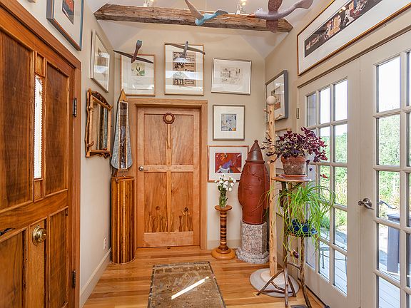 This property was designed and currently owned by Tommy Simpson noted artist and studio furniture maker. Details in specialty hardwoods throughout the home include custom fireplace mantle, kitchen cabinets, doors, windows, eating nook, kitchen island, builtin armoire cabinets and handcrafted details throughout. This Custom built home featuring expansion opportunity with unfinished lower level area with walk out. A variety of different types of woods used throughout this home. A mahogany and Walnut front door welcomes you to your foyer. Opens into the living room with gas fireplace framed with a Cedar posts, Cherry Mahogany mental. Plus the 10 ft ceilings. Custom-built kitchen with Walnut and bird's-eye Oak built-in table. Granite countertops. The kitchen cabinets are built from Figured Maple, Butternut & mixed woods used to create the cabinets. Dining room just off the kitchen with doors open to rear deck. 13 x 29 Studio space plus a 24 x 34 wood floored room with westerly views and light. Master bedroom with full bath and tile shower, Deep soaking tub. A second bedroom with full bath and third bedroom offers a half bath. Gardens and stone walls on proximately 12 acres with a combination of open field and some Woodlands. Min from New Preston center and Washington Depot.