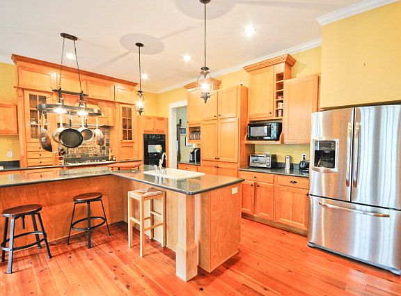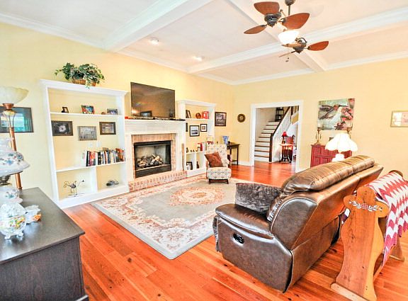 Fabulous Open Floor Plan! Approx 2 Acres 4 bedrm 3 1/2 bath rocking chair front porch beauty! Awesome reclaimed heart of pine hardwood floors that came out of an old warehouse in Charleston, S.C. Coffered beamed ceilings, transoms above all windows and front door, fireplace with gas logs, built-in bookcases, recessed lights and pocket doors! Many special features include breakfast area w/bay window & built in window seat, custom cabinets w/soft close cabinet doors & drawers, mixer lift, corian counter tops, six burner gas stove, built in vent hood, pot filler, dble ovens, spice & plate racks, wine rack, vegetable sink & wrap around breakfast bar. Owners suite 1st flr w/tray ceiling, dble sink vanity, clawfoot tub & separate shower! Screen porch, patio, carport & more! Located just a couple minutes from I-20 and Exit 1 with quick easy access to Augusta, Aiken, North Augusta & Edgefield! No city taxes and qualifies 100% usda financing!