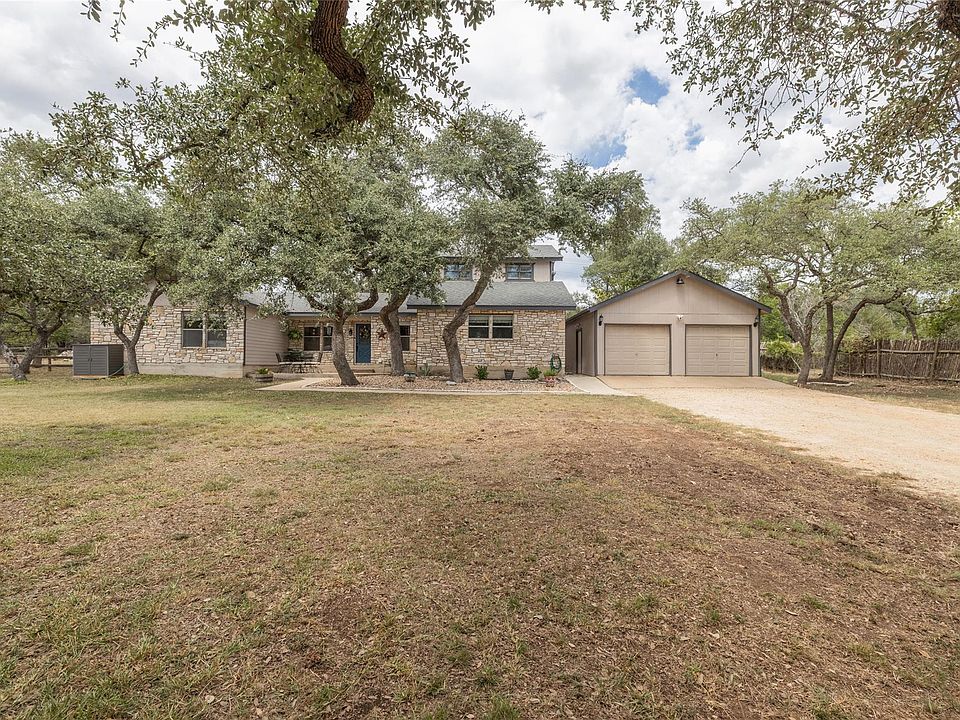 Set on 2 private acres shaded by gorgeous mature trees, this 1.5-story home is tucked into the desirable Oak Springs subdivision in Dripping Springs. With 4 bedrooms, 3 full baths, and 2 spacious living areas, the layout offers both comfort and flexibility—perfect for multi-generational living or hosting guests.The home features two primary suites, each offering privacy and convenience. The main living room is warm and inviting with abundant natural light and a cozy wood-burning fireplace at its heart. The second living room is a cozy den with cedar plank walls, creating a rustic yet comfortable retreat. Upstairs, you’ll find the second primary suite, a private haven ideal for guests or extended family. Beautiful wood floors in all downstairs bedrooms. Recent updates throughout bring a fresh feel while maintaining the home’s Hill Country character. Outdoors, enjoy the peace and privacy of 2 acres with mature oaks and open space for entertaining, relaxing, or play. A detached garage includes an additional storage room, ideal for hobbies, tools, or seasonal gear. RV hook ups too! Oak Springs is loved for its large lots, quiet surroundings, and welcoming community—all just minutes from Dripping Springs shopping, dining, and highly rated schools. This rare property combines acreage, privacy, two primary suites, and a wood-burning fireplace in one of the Hill Country’s most charming neighborhoods.
