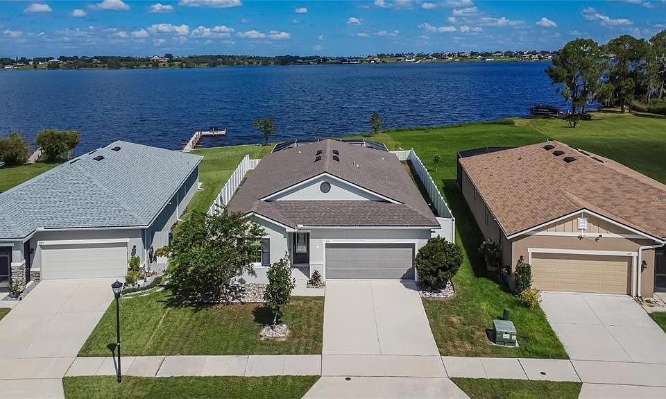 Live the lake life with this NO FLOOD INSURANCE REQUIRED meticulous waterfront 4 Bed, 2 Bath home in Watercrest Estates with NO CDD! Featuring one of the largest lots in the community, you will enjoy your amazing views of water and wildlife, as well as having direct access to Lake Van from your backyard. This original owner home had every detail thoughtfully chosen during the design process, and is truly light, bright, and welcoming to one and all. You will appreciate the luxury vinyl plank flooring, espresso cabinetry with soft close drawers and cabinets, and granite counters throughout the home, along with plenty of recessed lighting. The open floorplan and high ceilings give an airy feel and provide abundant space for everyday living, highlighted by the 8' interior doors and oversized sliding glass doors. You will enjoy the massive pavered lanai with a panoramic screen view of the lake, as well as privacy screening. The smart design provides quiet and privacy in the primary suite from the secondary bedrooms and bath which are split between two other wings of the home. The owners have fully fenced the backyard, and have electric fencing installed for the section of the yard between the vinyl fencing and lake. They included additional exterior outlets for holiday lighting or outdoor television/kitchen usage. In addition, they have gutters in the front and rear of the home. Living on the private waters of Lake Van allows you to build a dock for your boat or jet skis and enjoy the lake lifestyle in Florida. There is also a community pool, with a nearby boat dock and ramp, large public park, playground and shopping less than 10 minutes away. Thank you for your interest and for taking the time to see this home in person!