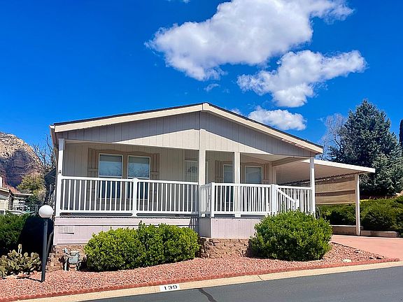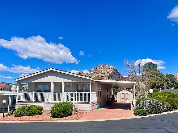Spacious 2005 model, 2 bed, 2 bath 1568 sq. ft. manufactured home in West Sedona This home is located on a corner lot in a quiet central location in the park. It features a large entry deck, perfect for enjoying the fantastic. mountain views of Sedona. The kitchen and living room are sizable with bright natural light. Both bedrooms have large closets, the master bath has a shower and the guest bath has a tub. The interior has fresh paint, laminate floors throughout and is being sold partially furnished. The carport has 2 parking spaces and a nice storage shed located on the end. The backyard is fenced and is perfect for a small dog and gardening. A new state of the art energy efficient heat pump has recently been installed. This home is move-in ready so make an appointment today to see this Sedona gem.
