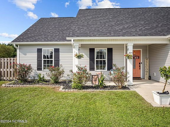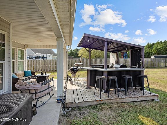 Welcome to this charming, well-maintained 2020 home nestled among picturesque rural landscaping on nearly one full acre of land. Privately located on quiet cul-de-sac, this is a wonderful opportunity to live in the established neighborhood of ''Palo Alto Crossing.'' From the moment you walk in the front door, you will appreciate the character, stylish upgrades, and thoughtfully designed layout of this home. The split floor plan ideally separates the primary bedroom from the two secondary bedrooms and full bathroom, providing the desired privacy and peacefulness to unwind from it all. With LVP throughout, trey ceilings, wall-to-wall windows, and a cozy fireplace, the open-concept family room segues nicely into the fully-equipped kitchen, dinning area, and office space. The impressive eat-in kitchen has stainless steel appliances, including a custom sink, elegant black and white tiled backsplash, soft-close cabinetry, and ample counter space, ready for your inner chef to create delicious dinners for yourself and guests for years to come. The large primary bedroom has plentiful natural lighting and is highlighted by an ensuite that has durable tile flooring and offers double vanities, a relaxing soaker tub, a sleek tiled stand-up shower, and two walk-in closets. Equally impressive to the inside of this home is the outdoor space, which offers a covered front porch and a fenced-in backyard with a storage shed, covered patio, and a Blackstone BBQ Grill and Bar Gazebo, allowing you to extend your indoor living outdoors for entertaining and relaxing year round. What's more, for your vehicles, boats, and/or RVs, this home has both an attached two-car garage for covered parking and additional concrete parking. Your new home sits just twenty-five minutes from Jacksonville for shopping, dining, and entertainment and from the Crystal Coast beaches of Emerald Isle for those day trips of fun in the sun fishing, boating, swimming, shelling, etc. This home is where your heart is!