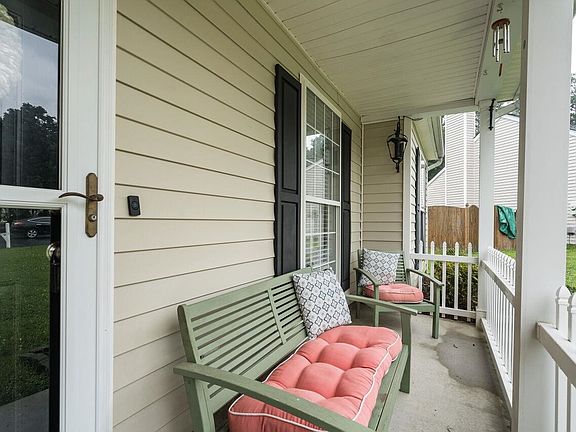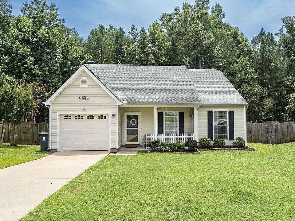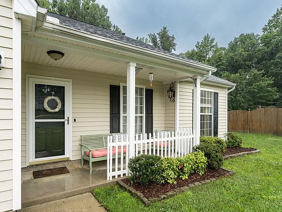BUYER GOT COLD FEET!! Absolutely darling ranch at back of cul-de-sac w/fenced yard, deck & rocking chair front porch! This home has durable laminate flooring throughout common areas, Cathedral ceiling in family room w/gas log fireplace, archway window from kitchen, pantry, track lighting, tile backsplash & more. Primary BR features cathedral ceiling & fan, barn door to primary bath & walk-in closet. Community pool in neighborhood. Convenient (but NOT TOO close) to I-540, historic downtown Apex, shopping & more. New roof in 2020.