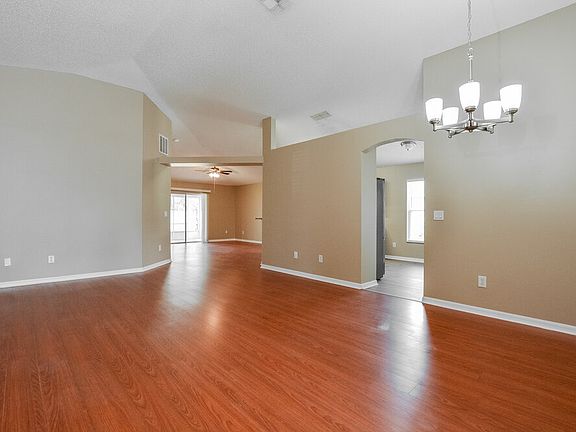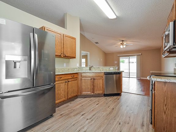 Please note, our homes are available on a first-come, first-serve basis and are not reserved until the holding fee agreement is signed and the holding fee is paid by the primary applicant. This home is priced to rent and won't be around for long. Apply now, while the current residents are preparing to move out, or call to arrange a meeting with your local Progress Residential leasing specialist today. This comfortable yet chic rental home in Edgewater, Florida has four bedrooms and two bathrooms. Gorgeous flooring runs through the main living spaces, including the dining room and family room. The family room has a lighted ceiling fan and a sliding door that opens to the enclosed tiled sunroom. This beautiful space is perfect for enjoying meals accompanied by backyard views. An adjacent kitchen includes ample counter space for food prep, stainless steel appliances, and easy garage access. The spacious main bedroom suite has a lighted fan and an exquisite en suite bathroom with a dual sink vanity, closet, and a roomy shower with seating. Call now to tour this stylish rental home.