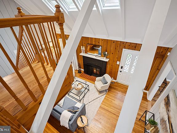 Chalet-Style Charm in the Heart of Four Corners/Woodmoor Conveniently located in the sought-after Four Corners/Woodmoor neighborhood of Silver Spring, this unique 4-bedroom, 2.5-bathroom chalet-style home offers character, comfort, and convenience all in one. With its striking A-frame vaulted ceilings, exposed beams, and skylights, the home is filled with natural light and architectural interest from the moment you step inside. The open living space features a cozy fireplace, an open staircase, and an upper-level overlook that adds to the home’s airy and dynamic layout. The updated kitchen is thoughtfully placed just off the main living area—ideal for entertaining—while still providing some separation. It features a gas range, huge pantry, dry bar, breakfast island, and sunny dining nook. Sliding doors off the kitchen lead to a spacious deck that overlooks the fully fenced backyard and parking area, making outdoor dining and everyday convenience effortless. A separate rear entrance leads directly into the kitchen—perfect for bringing in groceries. Two bedrooms on the main level include one with an en-suite full bath, while the other offers flexibility as a home office or guest room. Two bedrooms upstairs, including a light-filled bedroom that boasts a private balcony and a charming loft space accessed by a ladder—ideal for creative storage. All bathrooms have been stylishly updated with modern fixtures and sleek LED backlit mirrors. Additional features include newer HVAC, hot water heater, and windows, plus an unfinished basement with a bar, pool table, and laundry area—offering plenty of potential for future use or customization. Set above the street for added privacy and surrounded by mature trees, this home provides unbeatable proximity. Just steps from the shops and restaurants of Four Corners, less than a mile from Trader Joe’s, and with quick access to the Beltway, the location is as convenient as it is charming. Room for at least four cars to park, a storage shed, and a large fenced yard complete the package. An opportunity to live in Four Corners of Woodmoor at an unbeatable value.