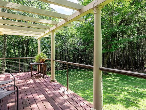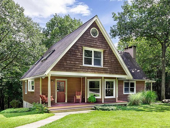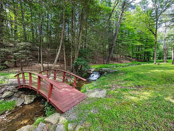 When a master craftsman builds his own home, the result is often superior. When he also sculpts the land upon which the house sits, and showcases the trees, stone walls, stream and waterfall in a way that creates a serene oasis, the result teems with spirit and integrity. This property is rare in its combination of attention to detail, quality and setting. The heart of the home is the spacious living room, with a beamed and vaulted beadboard ceiling, and a substantial stone fireplace. The adjacent sunroom features a wall of windows and skylights, an ideal spot to read or gaze into the woods. The kitchen cabinetry, as well as the multiple built-ins and wood accents throughout the home, were designed and built by hand with great care from maple and cherry. There’s a first floor bedroom and full bath, ideal for those who are challenged by climbing stairs. Up on the second floor, the home presents options – two bedrooms separated by a spa like bathroom, or a generous primary suite, using the room with built-in storage, barrel-vaulted ceiling and balcony as bedroom, and the other, with cove lighting, as a den, office or nursery. The full walkout basement is unfinished and offers a host of potential uses. The front porch is idyllic and overlooks the parklike setting, and the deck off of the sunroom offers different and equally enchanting vistas. Across the great lawn near the waterfall there’s a footbridge over the stream which leads to a stone fire pit and beautiful outcroppings. There are multiple sheds and storage buildings for vehicles, gear and equipment scattered about the land. The road is quiet year round, and there are seasonal views to the Catskills and the Shawangunk Ridge from this distinctive property.