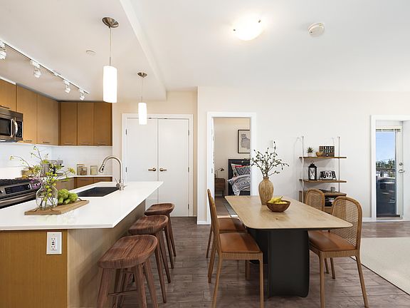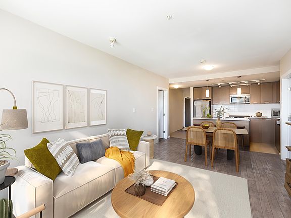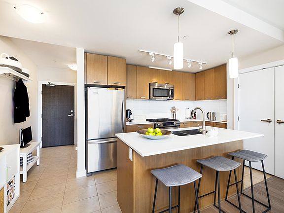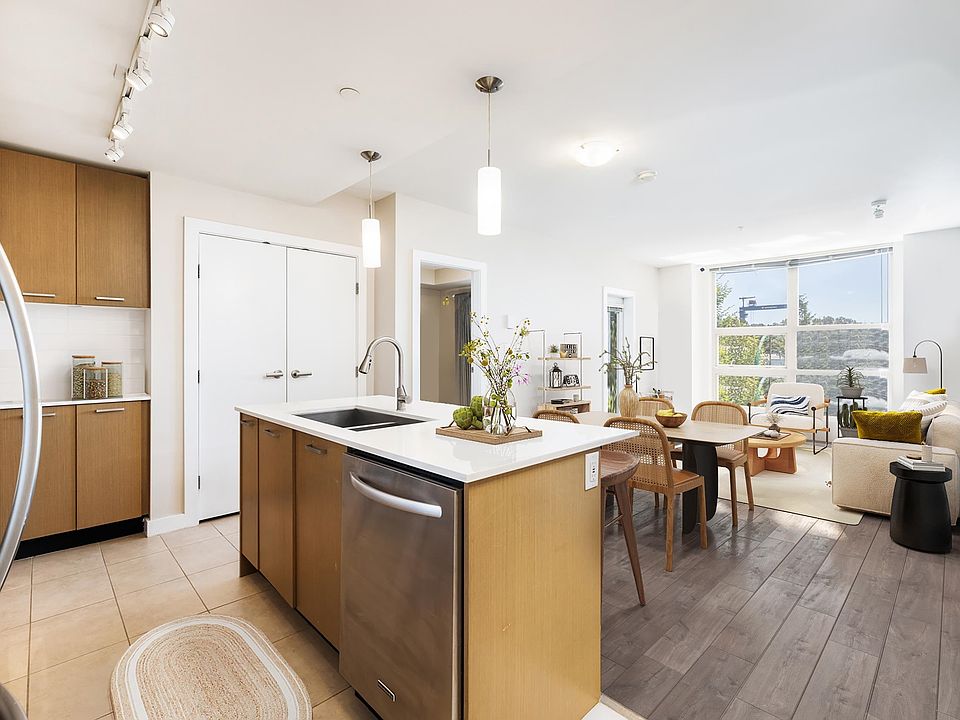 A very special over-sized, south-facing 2 bed, 2 bath home at The Drive, situated on a quiet cul-de-sac, but still just steps from Marine Drive. This remarkable home is bright, spacious and airy at 930sq ft with an open-plan layout, has hardwood floors, high ceilings, modern stainless steel appliances, a gas range and quartz countertops. The primary bedroom accommodates house sized furnishings and a walk-in closet, luxurious ensuite with soaker tub, walk-in shower, and heated floors. There are 2 balconies, both south facing & plenty of in-suite storage. The building offers a gym, party room, playground & entertaining kitchen. Ideal location near shopping, dining, transit and more, with 2 parking spots & a locker. Pets & rentals allowed. This one is a must see! OPEN HOUSE: OPEN: Thurs, Aug 1st 5-6pm & Sat, Aug 3rd 2-4pm.