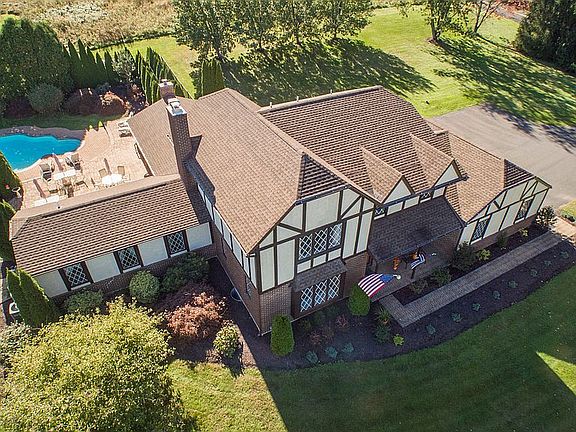 This beautiful stately Tudor home located in western Montgomery County (Douglass Township) boasts two wonderful owner's suites and other exceptional upgrades with the best views of the Upper Perkiomen Valley & Green Lane Park. Meticulously maintained inside and out, one of the first sights is the new oversized driveway and 3-car attached garage. An EP Henry walkway leads you to the stately entrance with lavish landscaping and a new stained glass mahogany front door. Once inside, the gleaming Cumaru Brazilian Teak flooring, upscale chandelier and new matching Teak stairwell are an impressive sight. The formal living room has newer carpeting, a tile box window with magnificent views plus added LED recessed lighting throughout. The dining room continues with the Brazilian Teak flooring and is complete with crown molding, an upgraded chandelier, leaded glass French doors plus pocket doors for an added wow factor! The kitchen is the hub of this fine home and will be one of the nicest kitchens you have ever seen! The owners spared no expense with Kraftmaid solid maple/painted white plus solid cherry glazed cabinetry, an island with seating, pendant lights and vegetable sink, granite counters, upgraded faucets, stainless Kitchen Aid appliances, double wall ovens with convection, under cabinet lighting, subway tile and mosaic backsplash. The den/breakfast room has a wine fridge plus a wood burning fireplace insert. The first floor owner's suite has teak flooring, a tray ceiling, crown molding, a ceiling fan, a walk-in closet, a luxurious bath with a jetted heated tub and tile surround, a seamless glass over-sized shower, double sinks w/Silestone counters, marble floors and custom tile. The family/great room has a wood-burning fireplace, 3 separate custom French doors leading to an extensive EP Henry patio and pool plus garden and lighted hardscaping; your own private oasis. The upper level has a second owner's suite, a luxury owner's bath, solid marble vanity and tub deck and seamless glass shower. There are two additional bedrooms plus a hall bath with espresso cabinet custom mosaic tile on this floor. There's an upper level laundry room for added convenience. The lower level is also completely finished. This remarkable estate home is also close to shopping, schools and major highways. Schedule your tour today!