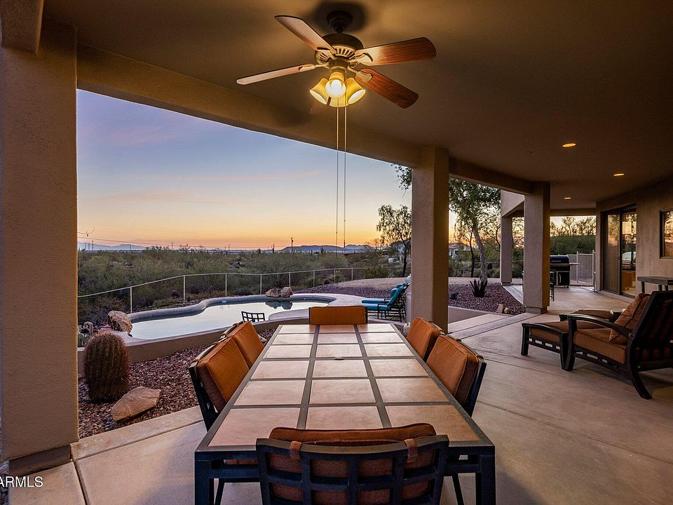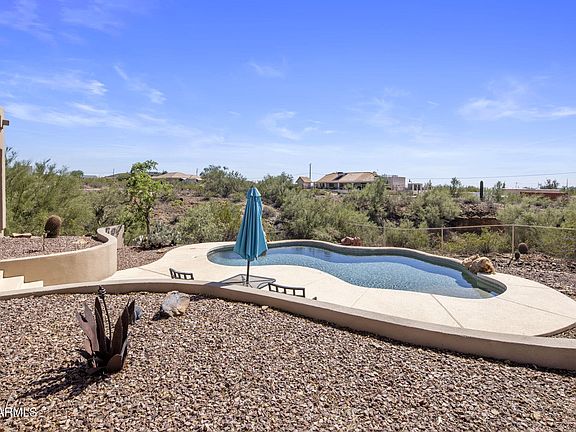Only 2 blocks from Sonoran Mountain Preserve with 38 miles of trails! This private oasis offers city lights and mountain views, with plenty of space for all of your toys! The open floorplan features wood beamed ceilings and Arcadia doors to create a bright, inviting space. A spacious kitchen includes granite counters, custom cabinetry and plenty of storage. The primary suite is spacious, offering two walk-in closets and a large bathroom with double sinks, jetted tub and walk-in shower. Outside, relax on the covered patio or in the pebbletec pool, enjoying beautiful sunset views! New in 2023: Exterior paint, 2 AC units, carpet in bedrooms and re-coated foam roof. Private well to be installed prior to closing. Located close to Norterra and Deer Valley Airpark, with easy freeway access.