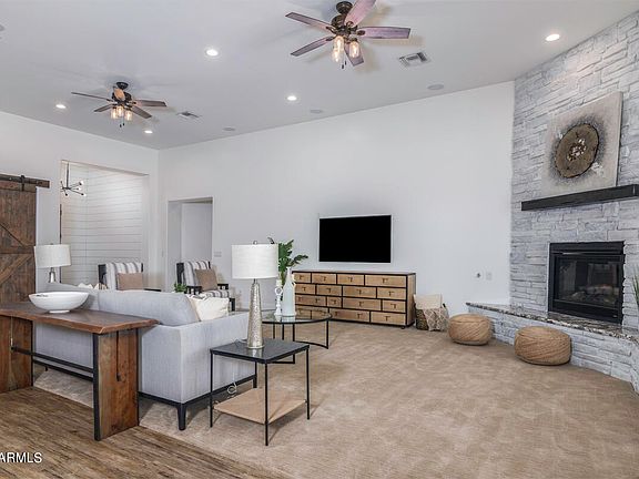 Interior modern finishes include 10- and 12-foot ceilings, high end white kitchen cabinets, energy efficient Anderson 100 series windows & whole home charcoal filtration system. Every corner of this home has quality features like raised countertops, open concept floor plan, waterfall edge custom kitchen island, a huge walk-in pantry, charming shiplap, beautiful fireplace walk in closets & large bedrooms. Make your way through this architectural masterpiece, you'll discover a haven of relaxation and rejuvenation. This home offers large secondary bedrooms, each with its own bathroom that offer ample space for your family. The backyard features a newer custom pool with a water feature, extended covered patio & upgraded pavers. This almost 4-acre property offers a 4-stall barn with hay bay, 8'x 220' tack room, rock picked sand riding arena, flood irrigated pastures & community gates for entrance from the West & with a newer paved entrance road connecting soon from the Southeast. The seller added block upgraded fencing, new doors & an updated riding arena recently. This home truly shows pride of ownership. The large 3 car garage offers an electric car charging upgrade & epoxy flooring. This private oasis offers you tranquility with many modern conveniences nearby such as nearby retail, schools, restaurants & grocery stores such as a Fry's Marketplace and a Sprouts.