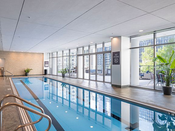 Building has front desk concierge, attached garage parking, onsite package system, 24 hour fitness center, indoor lap pool and more.