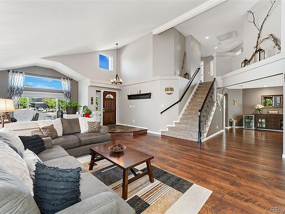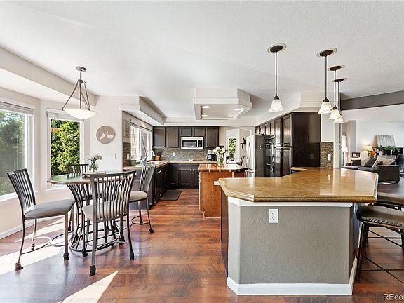 Immaculate two-story home nestled in the serene Westridge Glen neighborhood of Highlands Ranch! This prime residence boasts a tranquil location facing a cul-de-sac, offering peace and privacy that's rare to find. Step inside to be greeted by high ceilings and a spacious layout that includes a large front living room and a versatile flex space, ideal for a home office or study. The open concept kitchen is a chef's delight, featuring an island, black and stainless steel appliances, solid surface countertops, and a convenient breakfast nook in addition to formal dining space. This home offers an ideal setting for entertaining, whether you prefer gathering indoors or enjoying the expansive deck and patio area. The cozy family room centers around a gas fireplace, creating a warm ambiance. An upgraded banister leads you to four generously sized bedrooms, including a luxurious primary suite with double doors, dual walk-in closets, and a spa-like five-piece ensuite bathroom with eye-catching finishes. The full-length insulated basement provides ample storage or awaits your personal touch for additional living space. Outside, the beautifully landscaped backyard beckons with a large deck shaded by mature trees, a fire pit seating area, and a raised garden bed with a drip system. Recent upgrades include fresh exterior paint in 2023, enhancing the home's curb appeal. Additional features include a three-car garage with new doors installed in 2023, a Wi-Fi thermostat, front and rear door coded locks, Ring Alarm system, and outside Arlo cameras for added security. Solar panels contribute to energy efficiency, complemented by a new 50-gallon water heater also installed in 2024. Enjoy the convenience of Highlands Ranch living with access to the HRCA's state-of-the-art recreational centers spanning over 329,000 square feet, offering workout spaces, meeting rooms, event venues, sports courts, and more, ensuring a vibrant lifestyle for all members. Welcome home!